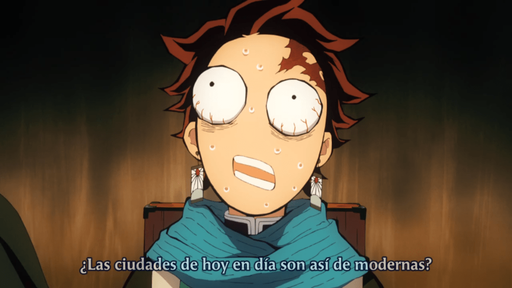 Tanjirō nació en un pequeño pueblo de montaña, muy lejos de todo el ambiente urbano, por lo que no es de extrañar que, tras llegar y ver de golpe avances como el tranvía (Toden), coches, la luz eléctrica o tanta acumulación de gente quede tan confuso que hasta sufra un mareo.