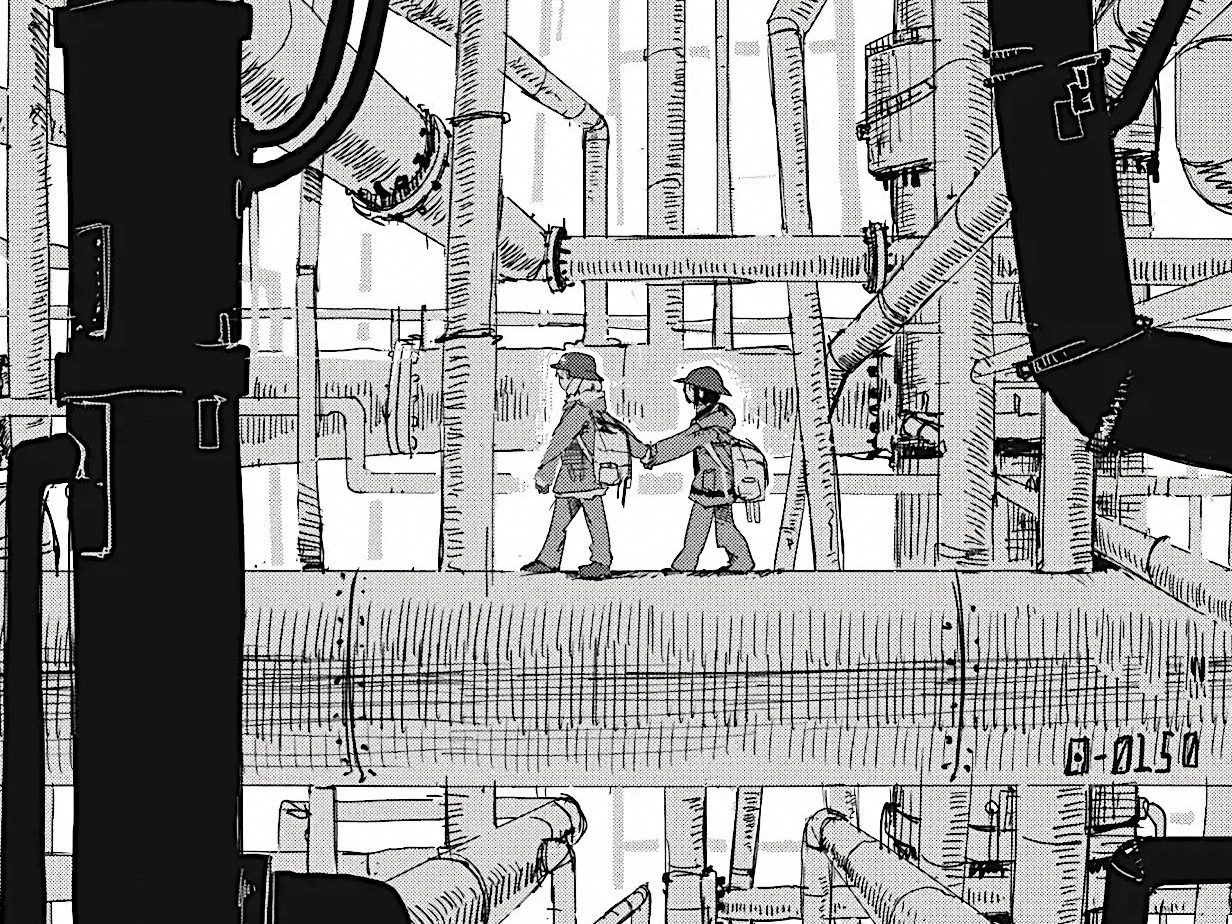 En un reflejo más melancólico y frío del entorno postapocalíptico, Girls’ Last Tour nos presenta a Chito y Yuuri recorriendo un páramo congelado e industrializado a bordo de la motocicleta oruga Kettenkrad. Aun con similitudes, aquí el mundo es uno mucho más desolado que el Japón de Shūmatsu Touring, en el que la excesiva mecanización del mismo se hace evidente a lo largo de impresionantes paisajes de metal y vacío. El optimismo que más brilla en este manga es el vínculo de sus dos protagonistas y como su mutua compañía es lo que las hace seguir adelante y disfrutar cada día.