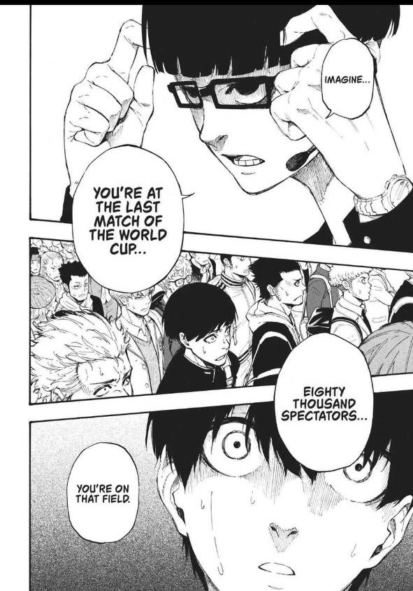 Pero yendo al argumento en sí, haber leído el resto de la obra del autor hace que este manga cobre aún más importancia, y es que vemos que en él recoge temas y tramas que ya trató en historias anteriores. Para empezar, lo que hace interesante a Blue Lock es que en sus inicios está planteado como un survival / killing game, como As the Gods Will, pero usando el fútbol como vehículo. Esto hace que de por sí sea una obra distintiva de otros spokon más centrados en clubes de instituto y en ir al típico torneo nacional —de hecho, Kaneshiro demuestra ya desde el principio su intención de alejarse de ese tropo haciendo que el protagonista pierda la ronda clasificatoria para ir al nacional de fútbol—; pero no es el único elemento diferenciador: y es que Blue Lock realmente está planteado como un shonen de peleas más que como un manga típicamente deportivo, pero sin que deje de dar la sensación de que estás leyendo un spokon. Aquí Kaneshiro vuelca todo su conocimiento y experiencia habiendo guionizado previamente mangas de peleas, pero no solo eso, sino que también incorpora elementos de terror e incluso body horror —y aquí la mano de Nomura demuestra ser también especialmente valiosa tras haber dibujado antes un manga de terror, Dolly Kill Kill—. Interesante es también el tema del ego y la individualidad, que son el motor de la trama, y que constituyen una excusa para criticar el inmovilismo de la mentalidad japonesa.