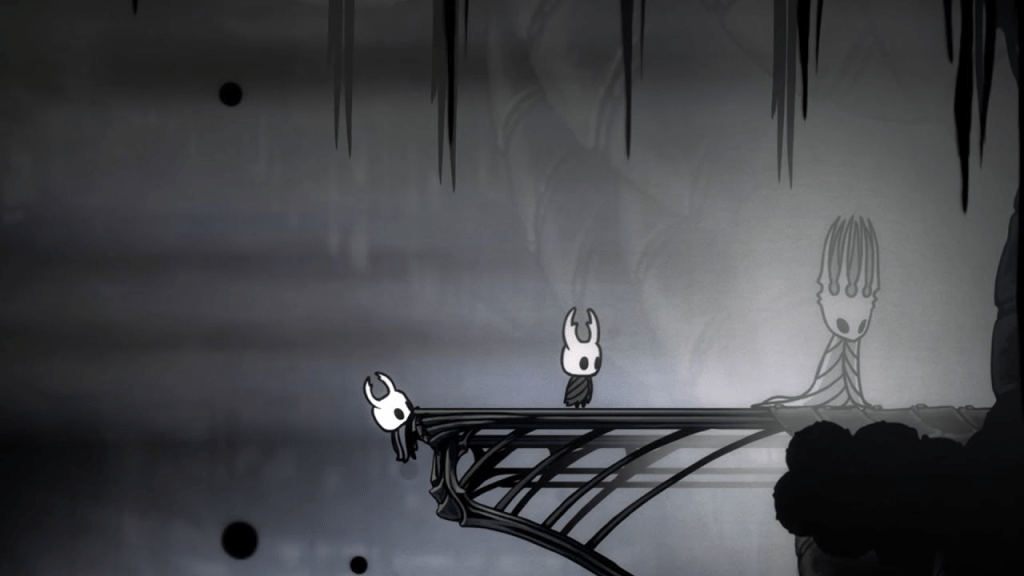 Dignos de elogio, por su parte, son aquellos supuestos en los que la existencia de los protagonistas silenciosos, mantenida por las ya citadas oportunidades que presentan —a la par que, todo sea dicho, por pura tradición—, funciona al servicio de la narrativa. Sería este el caso de títulos como Hollow Knight, en el cual interpretamos a un pequeño insecto que parece llegar a Hallownest y vagar sus cavernas por inercia, en lugar de movido por un deseo de hallar algo en concreto. No reaccionamos de ninguna manera a lo que ocurre a lo largo de nuestro viaje, ni siquiera cuando la vida de los demás exploradores está en peligro. Si bien podemos reconducirnos al valor intrínseco del silencio en obras atmosféricas, Team Cherry va un paso más allá y emplea el lenguaje propio del videojuego para reforzar su mundo rico y colmado de detalles. Nuestro protagonista es un receptáculo, un bicho infusionado de una sustancia llamada vacío por el Rey Pálido, el antiguo monarca del reino en sus tiempos prósperos. Tanto él como sus miles de hermanos fueron creados como parte de un terrible experimento para encontrar una vasija pura —es decir, sin sentimientos, emociones ni deseos—, capaz de contener la infección que amenazaba la paz en Hallownest. El homónimo Hollow Knight es a quien se encomendó originalmente esta misión, pero el paso de las eras ha hecho que su coraza se debilite. Nuestro cometido, así, es reemplazarlo.