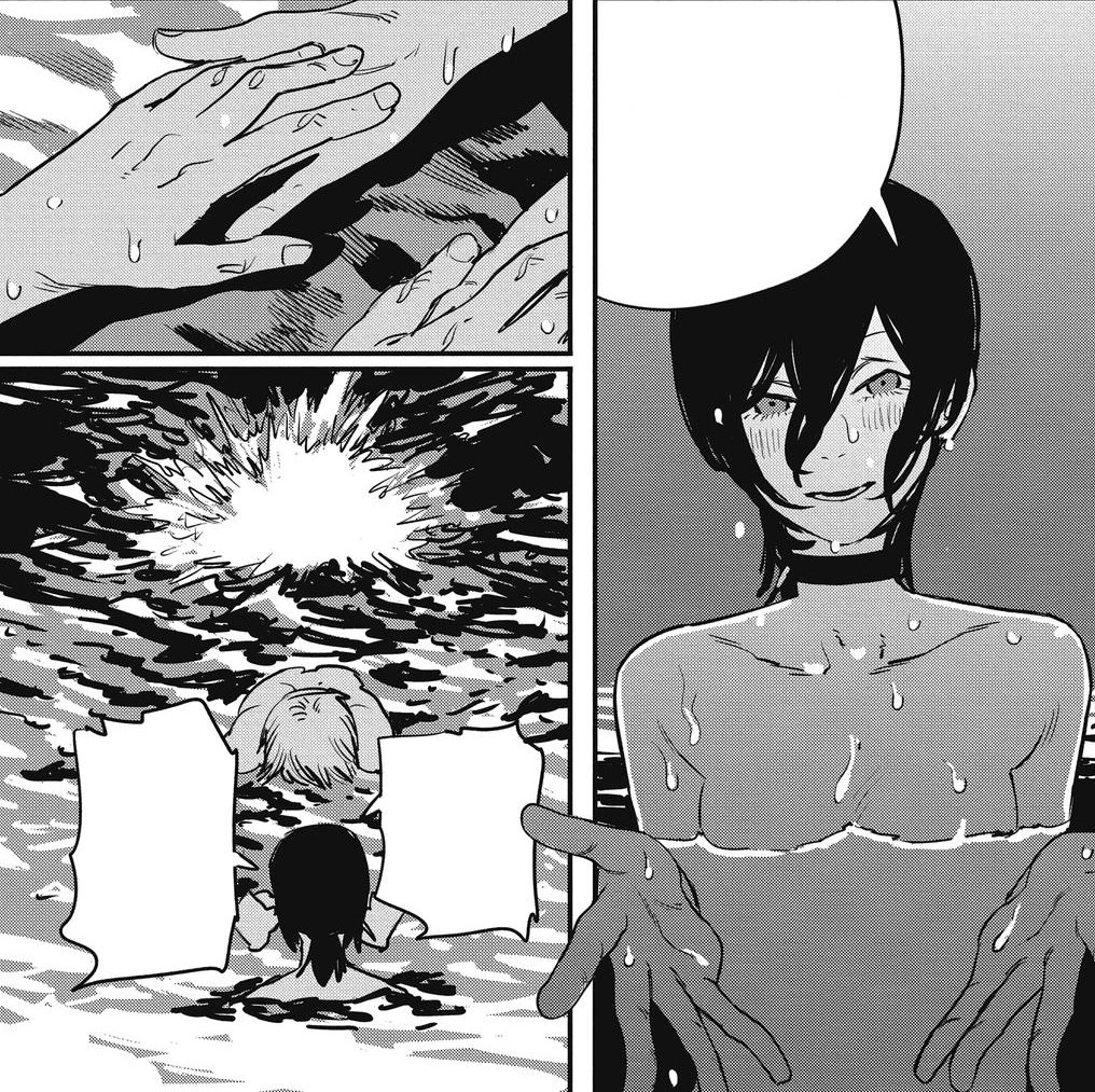 La desnudez en Chainsaw Man solo se muestra como algo pornográfico cuando es a través de los ojos de Denji. Volviendo a la escena de Reze en la piscina, podríamos aseverar que el mero hecho de que esté desnuda implica que hay una erotización de por medio, pero la escena no nos demuestra lo mismo ya que no tiene ninguna implicación más allá ni estamos presenciándola desde un encuadre pornográfico. Lo que más nos puede acercar a ello es el mismo Denji proyectando su propio deseo sexual en Reze, así como lo hace en otras ocasiones con Makima o Himeno. Pero tachar escenas como la de la piscina o aquellas en las que la vemos semidesnuda por estar convertida, al igual que pasa con Quanxi, implicaría que no podemos separar el cuerpo femenino del mismo deseo. El cuerpo desnudo de una mujer no es inherentemente sexual, debido a que el deseo mismo se sitúa en aquel que presencia y en este caso tampoco estamos hablando de una incitación expresa o una búsqueda del mismo, ya que, como hemos observado antes, los encuadres resultan corrientes y molientes.