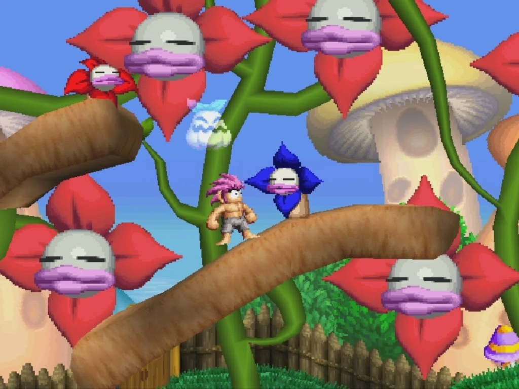 Tombi! —cuyo nombre original fuera de Europa es Tomba!— es una serie de juegos desarrollada por la ya difunta Whoopee Camp a finales de la década de los noventa. En estos títulos encarnamos al muchacho homónimo, un niño salvaje de pelo rosado que de una forma o de otra acaba en un gran conflicto contra el nefario ejército de los cerdiablos, grupo que asola al mundo con su magia oscura y suele poner trabas en el viaje de nuestro pequeño héroe. Con un estilo muy similar al de un metroidvania pero con un enorme énfasis en las plataformas, el núcleo de esta bilogía se basa en el sistema de eventos. Se trata de una serie de misiones —más de 100 por juego—, tanto principales como secundarias, que engloban toda la aventura y marcan tanto el ritmo de las zonas individuales como el progreso global del juego. El jugador tendrá que ir yendo y volviendo entre los extravagantes mundos que ofrece cada entrega para ir cumpliendo todas las tareas que aparezcan, algo que, unido al reducido tamaño de cada zona, convierte a la aventura en un pequeño puzle dentro de un diorama, más similar a títulos como Link’s Awakening que a Symphony of the Night.