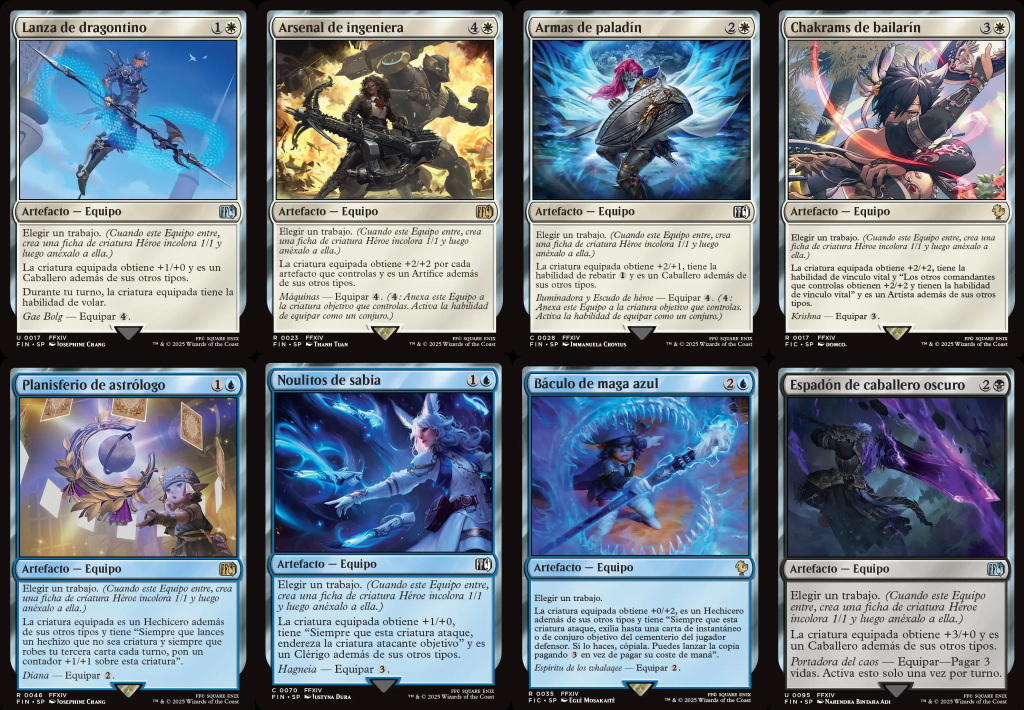 Algunos de los que se pueden ver encabezando estas líneas son las armas de los trabajos clásicos de la franquicia, como el dragontino, el paladín o el caballero oscuro, aunque los más inspirados en el MMO también están. Planisferio de astrólogo permite a su controlador fortalecerse cada vez que se lanza un hechizo o cada vez que se roba la tercera carta cada turno. A pesar de lo aparentemente extraño de esta segunda condición, la mecánica básica de los astrólogos en FFXIV consiste en robar tres arcanums, lo que establece el paralismo con este trabajo en el juego. Chakrams de bailarín ofrece un +2/+2 a la criatura equipada, así como a otra objetivo, la que dentro del videojuego se conoce como pareja de baile. Los bailarines pueden bailar para potenciar a sus aliados, pero especialmente a su pareja de baile, quien será representada por esta otra criatura. Si bien equipos como Lanza de dragontino, Noulitos de sabia y Espadón de caballero oscuro ofrecen efectos más o menos temáticos con sus respectivas iteraciones dentro de Final Fantasy XIV, no brillan especialmente, o no tanto como Báculo de maga azul, que representa casi a la perfección este trabajo. Los magos azules de la saga son famosos por su capacidad de aprender hechizos enemigos de los que han sido objetivo y poder utilizar versiones normalmente menos potentes en combate. En este caso, cuando la criatura equipada con el Báculo de maga azul ataque, su controlador exilia un instantáneo o conjuro de su cementerio —es decir, un hechizo que ya se ha jugado y el mago azul ha podido aprenderlo— y puede lanzarlo a un coste reducido.
