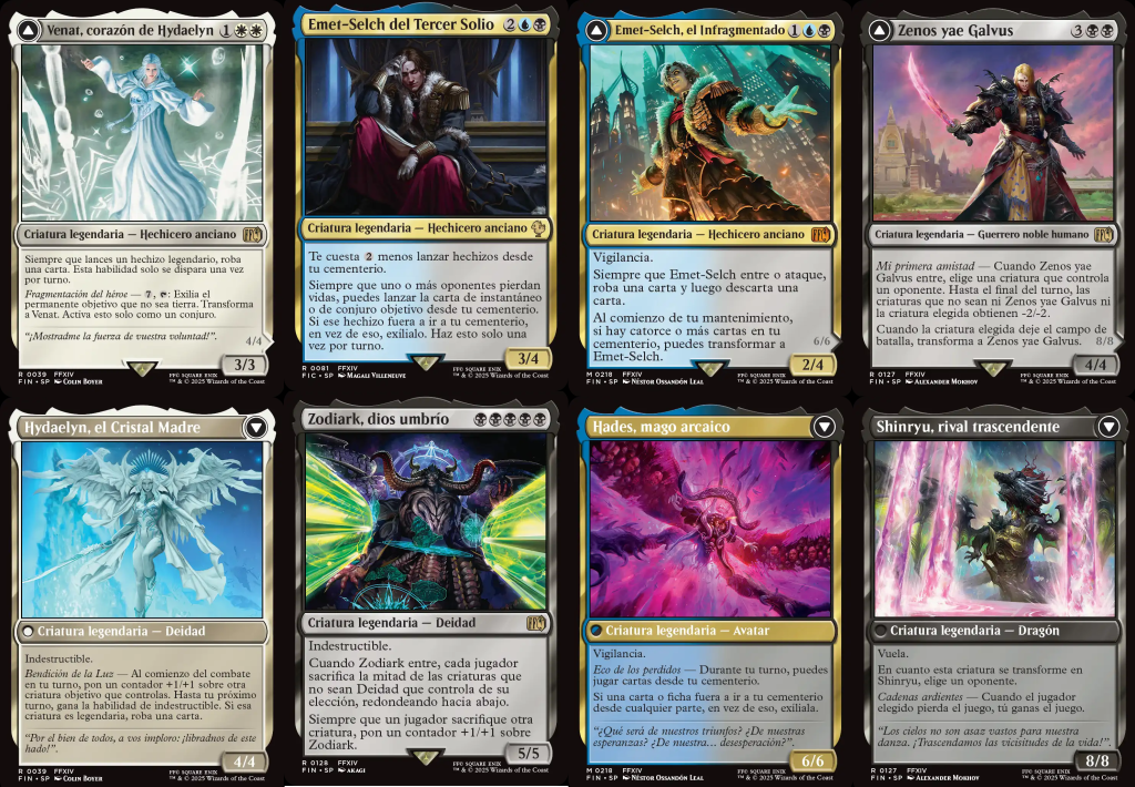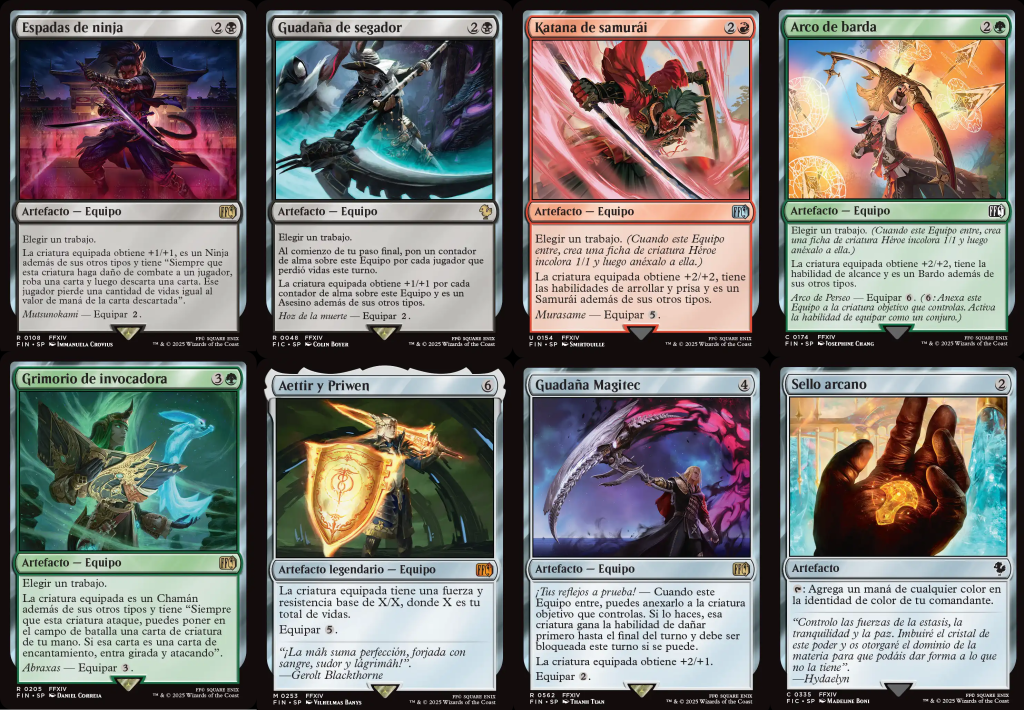 Otras cartas de equipamiento son más un guiño a su propia mecánica en Magic que en Final Fantasy. Espadas de ninja permite al dueño de la criatura equipada robar una carta para después descartar otra al hacer daño de combate a un enemigo, el cual sufrirá daño igual al coste de maná del descarte. Este tipo de mecánicas son comunes entre los ninjas en Magic —sin ir más lejos, la comandante más popular de ninjas, Yuriko, la Sombra del Tigre, tiene una bastante similar—, pero que no representa ni las habilidades del trabajo en el juego ni su fantasía de clase. Y entre más armas sin ningún tipo de sabor como Katana de samurái y Arco de barda, se encuentra Grimorio de invocadora, un imprescindible en mazos de invocaciones comandados por Yuna, gran invocadora o Terra, versada en la magia. Quien esté equipado con este grimorio puede invocar cualquier criatura desde la mano sin pagar su coste de maná, lo que resulta en un efecto aún más poderoso si es además un encantamiento —como son todas las invocaciones del set—. Si bien, de nuevo, no representa exactamente el trabajo del juego, sí que es una forma muy interesante de mostrar toda una clase a lo largo de la franquicia, más que una iteración específica. Además de Armas de paladín, que se pueden ver un poco por encima de estas líneas, los paladines han tenido representación doble con Aettir y Priwen, una carta que muestra las armas ánima de la clase en su máxima forma, algo que pilló por sorpresa a toda la comunidad por lo específico dentro de la gran cantidad de reliquias que se pueden conseguir en el juego. Por último, es interesante mencionar la presencia de Guadaña Magitec, el arma de Zenos en su combate final con el Guerrero de la Luz. Su habilidad ¡Tus reflejos a prueba! —un meme recurrente de la comunidad— ofrece a la criatura equipada unas habilidades similares a las de La Masamune de Sefirot. Lo cierto es que para ser una verdadera prueba para los reflejos del oponente a este artefacto le falta destello —la habilidad de jugarlo como si fuera un instantáneo—, pero es una representación bastante interesante del molesto ataque de Zenos durante ese combate.