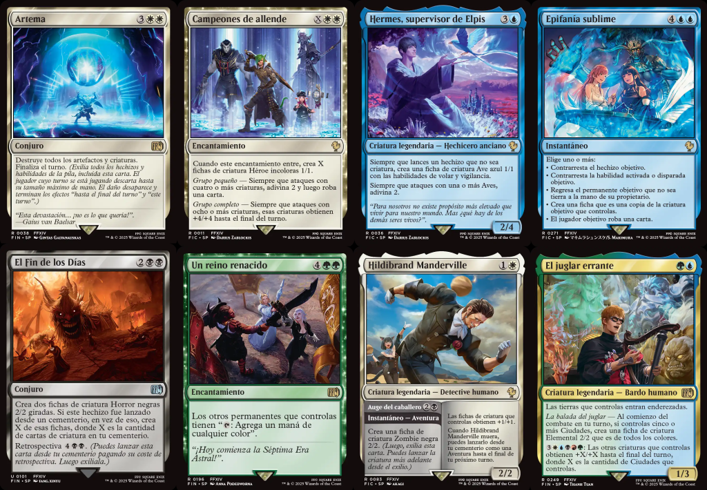 Nos indican desde arriba que hemos dado mucho la turra con Final Fantasy XIV, que todavía quedan dos juegos más que cubrir y esto empieza a ser muy largo, así que es hora de cerrar con unos últimos párrafos para algunas cartas que se vinculan a elementos de la historia mencionados anteriormente. Artema, uno de los hechizos más poderosos más poderosos de la saga, aparece en este sobre como un barremesas, con la peculiaridad de que, al jugarse, acaba el turno. Con las algunas combinaciones concretas, un conjuro como Artema puede lanzarse como instantáneo y no solo acabar con todas las criaturas, sino terminar abruptamente el turno del rival. Campeones de allende hace referencia directa a la habilidad de G’raha de invocar héroes de otros mundos y, en función de la cantidad de criaturas que ataquen, si llegan a cuatro u ocho atacantes —los dos tamaños de grupo en FFXIV—, se activarán habilidades especiales. También se pueden crear héroes adicionales al lanzar el encantamiento, lo cual lo convierte en una opción muy sólida en mazos comandados por G’raha Tia, Vástago renacido. Hermes, supervisor de Elpis es una carta también muy bien pensada para trasladar las acciones de este científico anciano a las mecánicas del juego. Durante su tiempo en Elpis, Hermes desarrolló unos pájaros para que exploraran el universo, por lo que cada vez que cada vez que se lanza un hechizo, se crea un ave azul que tiene las habilidades de volar y vigilancia y que, cada vez que una de ellas ataque, su controlador podrá adivinar 2, mostrando así las habilidades de exploración de Meteion y sus hermanas. Es curioso que de los ancianos de Endwalker el equipo de diseño se inclinase por Hermes en lugar de Hythlodaeus, que es un personaje mucho más popular y querido, siendo éste el único que ni tan siquiera aparece de fondo en ninguna ilustración del set. El Fin de los Días hace referencia al cataclismo que obligó a los amaurotinos a invocar a Zodiark y el hecho de que la amenaza vuelva más adelante en la trama está representado en forma de retrospectiva, pudiendo lanzar el hechizo una segunda vez desde el cementerio.