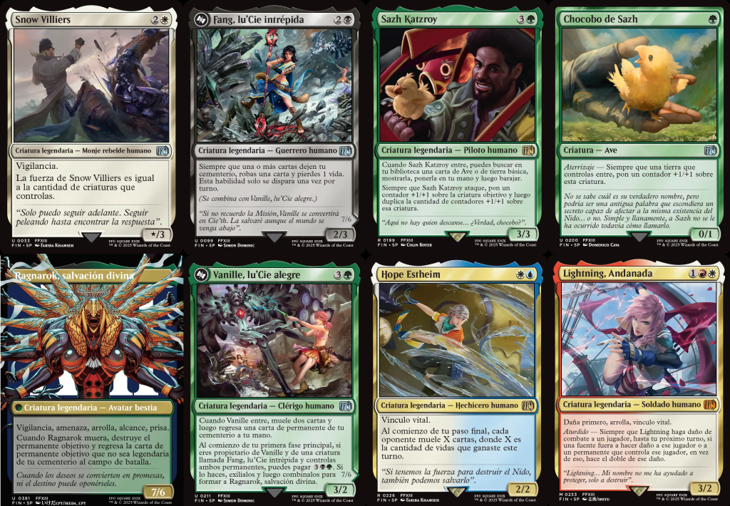 Aunque el grupo completo de Final Fantasy XIII está representado en el set, no todos han tenido el favorable tratamiento de su protagonista. Snow Villiers, por ejemplo, es una carta sin personalidad alguna —uno podría esperar que tuviera algún tipo de sinergia con Serah Farron, pero más allá de compartir un color no tienen ningún tipo de química— y que además presenta una versión muchísimo inferior a Adeline, cátara fulgurante, una de las comandantes más famosas a la hora de jugar arquetipos de mesa amplia con grandes cantidades de criaturas y fichas. Sazh Katzroy , por el contrario está supeditada a su broma recurrente —tener una cría de chocobo, que incluso tiene su propia carta— y tener habilidades muy sólidas para un mazo de aves y aterrizaje, pero que no representa en absoluta nada de su personalidad o trasfondo. Hope Estheim cae también muy del lado de Sazh, ofreciendo un nuevo arquetipo para formatos que puedan jugarlo consistentemente, como commander, que busca derrotar a los rivales dejándolos sin biblioteca de la que robar cartas a la par que su controlador gana vidas para aguantar los últimos embates enemigos.