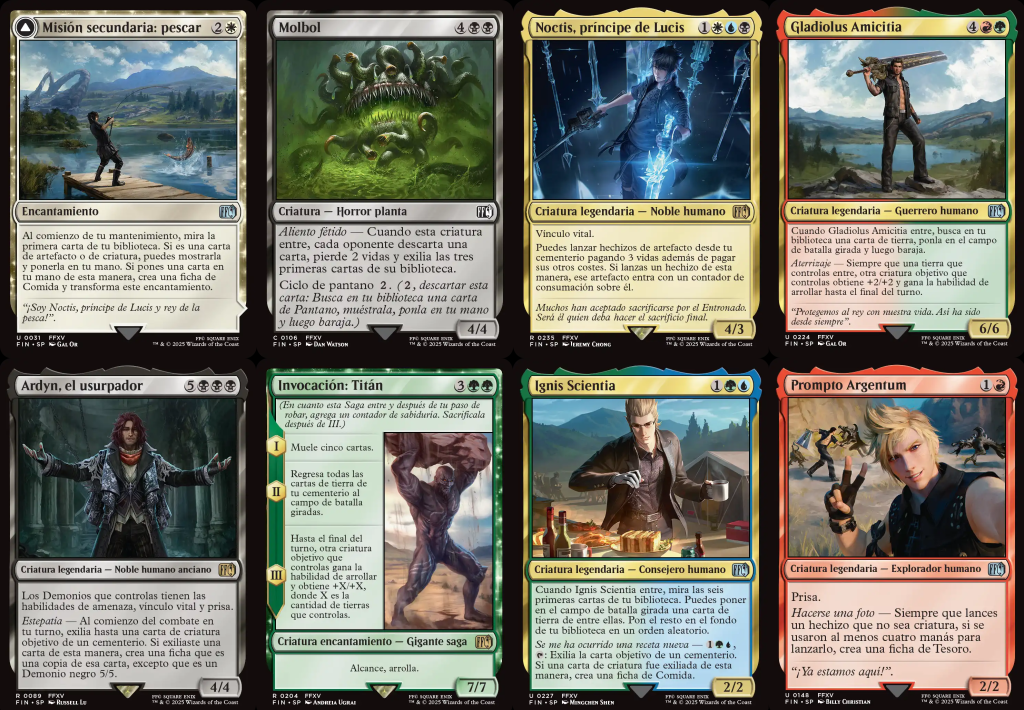 Es muy curioso cómo si alguien decide usar a Noctis como su comandante, ninguno de los tres compañeros podrían incluirse en el mazo que encabeza el Entronado. La ilustración de Prompto muestra muchísimo mejor su personalidad y forma de ser que las habilidades de su carta, que son mediocres. Gladio está construido para un arquetipo de aterrizaje gruul bastante ofensivo y que, a pesar de estar mucho mejor pensado que Prompto, da una sensación tan generalista que evoca poco al musculitos del grupo. Por último, Ignis es posiblemente quien mejor representación tenga de los tres, aunque podría ser algo más acertada. Es capaz de exiliar cartas enemigas en el cementerio —lo que serían monstruos derrotados— para obtener una nueva receta y crear una ficha de Comida, una de sus señas de identidad. También, aunque de forma distinta de Gladio, es capaz de poner una tierra en juego, obteniendo una sinergia interesante entre ellos. Hubiera sido muchísimo más acertado que Ignis se considerara una criatura con fuerza superior para poder pilotar vehículos, ya que es el conductor de facto del grupo, aunque hay que conformarse con el hecho de que El Regalia tenga una habilidad similar a la de Ignis para buscar tierras.