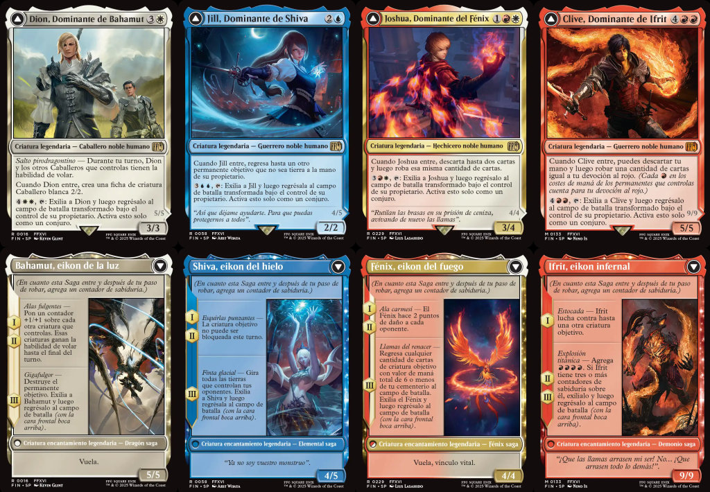 La más reciente —y, de nuevo, también polémica— entrega de la saga ha sido Final Fantasy XVI, con El juglar errante como productor del título. En esta ocasión, el mundo está regido por los llamados Dominantes, humanos capaces de invocar los poderes de los eikons, las invocaciones que se han ido viendo a lo largo del set como Bahamut o Ifrit. Esto ha sido traducido en forma de cartas de doble cara: la frontal con una criatura normal y la trasera con una criatura encantamiento, como todas las invocaciones hasta ahora. Tristemente, Final Fantasy XVI entró en el set de Magic por muy poco tiempo, por lo que no tiene tanta representación como otras entregas populares o relevantes del set, pero sí la suficiente para que los fans del título puedan armar mazos en torno a los personajes, especialmente Clive.