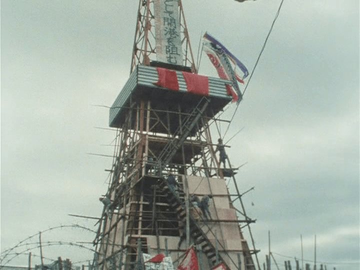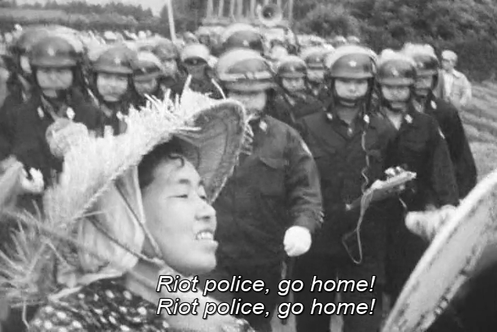 En octubre de 1967, por primera vez, llegaron técnicos de corporaciones aeroportuarias para instalar equipamiento de topografía en las tierras, protegidos por casi 2.000 policías antidisturbios. Los activistas realizaron una gran sentada para bloquear las carreteras y que no pudieran pasar. También destruyeron parte del equipo, formaron barricadas y arrojaron piedras, pero fueron atacados por la policía de una forma muy violenta. Tuvo un gran impacto la imagen de uno de los líderes del movimiento, Isaku Tomura, ensangrentado en el suelo. Al final, el equipo mandado por el gobierno pudo instalar algunos de sus equipos. Dos años después seguían luchando y la policía se volvió mucho más dura. Ello se ve en el arresto de Tomura y otros trece activistas por detener excavadoras.
