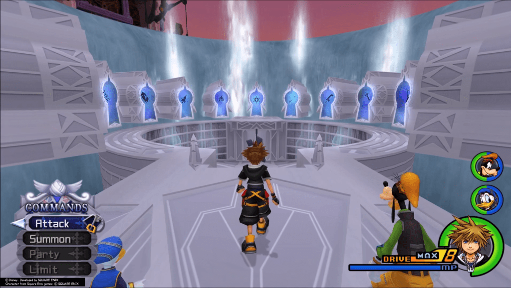 La primera entrega es, prácticamente, una compilación de cuentos para niños. Cada mundo funciona dentro de su propio contexto y, aunque nuestro trío siempre será ajeno a este, se entrometerá en los eventos de las películas originales sin jamás revelar que son viajeros. El propio juego introduce esto como regla intradiegética, obligando al grupo a funcionar dentro de las reglas establecidas en las propias películas. No, Sora no puede decir que conoce la existencia de mundos más allá, ya que ese conocimiento rompería el status quo de la diégesis. Lo divertido es ver a los protagonistas interactuar con obras originales, sin arrancar a los personajes de sus propias ficciones. Esto es clave para entender la saga pues, pese a que siempre habrá grandes tramas ocurriendo por encima de lo que pase en los eventos de los mundos e incluso paralelismos con el guion central, hay que entenderlos como pequeñas aventuras y disfrutarlos como experiencias cerradas, como si fuese un serial.