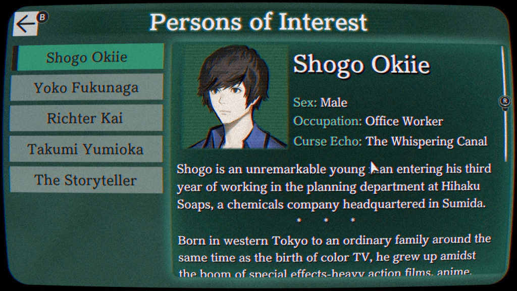 El calado cultural es mitad indivisible de la fórmula de Paranormasight: The Seven Mysteries of Honjo, completado por el carisma desbordante de sus personajes y sus mecánicas. Comenzaremos el juego a los mandos de Shogo Okiie, un tipo corriente que solo está interesado en el Rito de la Resurrección por su compañera de trabajo Yoko Fukunaga, a quien le encanta lo paranormal. No obstante, con el tiempo iremos cambiando de perspectiva —en algunos casos, de forma no lineal— para descubrir las motivaciones de los distintos usuarios de maldiciones. Los diversos elencos protagonistas varean entre la demencia y lo trágico, de tal forma que no siempre estaremos de acuerdo con su conducta, pero aun así podremos empatizar con qué los lleva a actuar de cierta manera. Dicha fricción atiende al carácter del jugador como un personaje más de la trama, observador pero no omnisciente. Esto se ve reflejado a través del Storyteller, una figura que se comunicará directamente con nosotros en momentos clave de la trama. En estas instancias de ruptura de la cuarta pared, se nos plantearán puzles en los cuales deberemos servirnos de las pistas del glosario o incluso de elementos de la interfaz para poder avanzar. Paranormasight emplea a las mil maravillas el lenguaje del videojuego para ofrecer momentos tan sorprendentes como contundentes, a nivel narrativo y jugable.